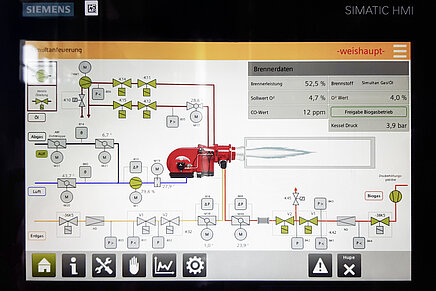 El suministro también incluyó el control del quemador fabricado y probado por Weishaupt con el controlador digital de combustión W-FM1000 CMS. La visualización y el funcionamiento se realizan a través de un panel táctil.