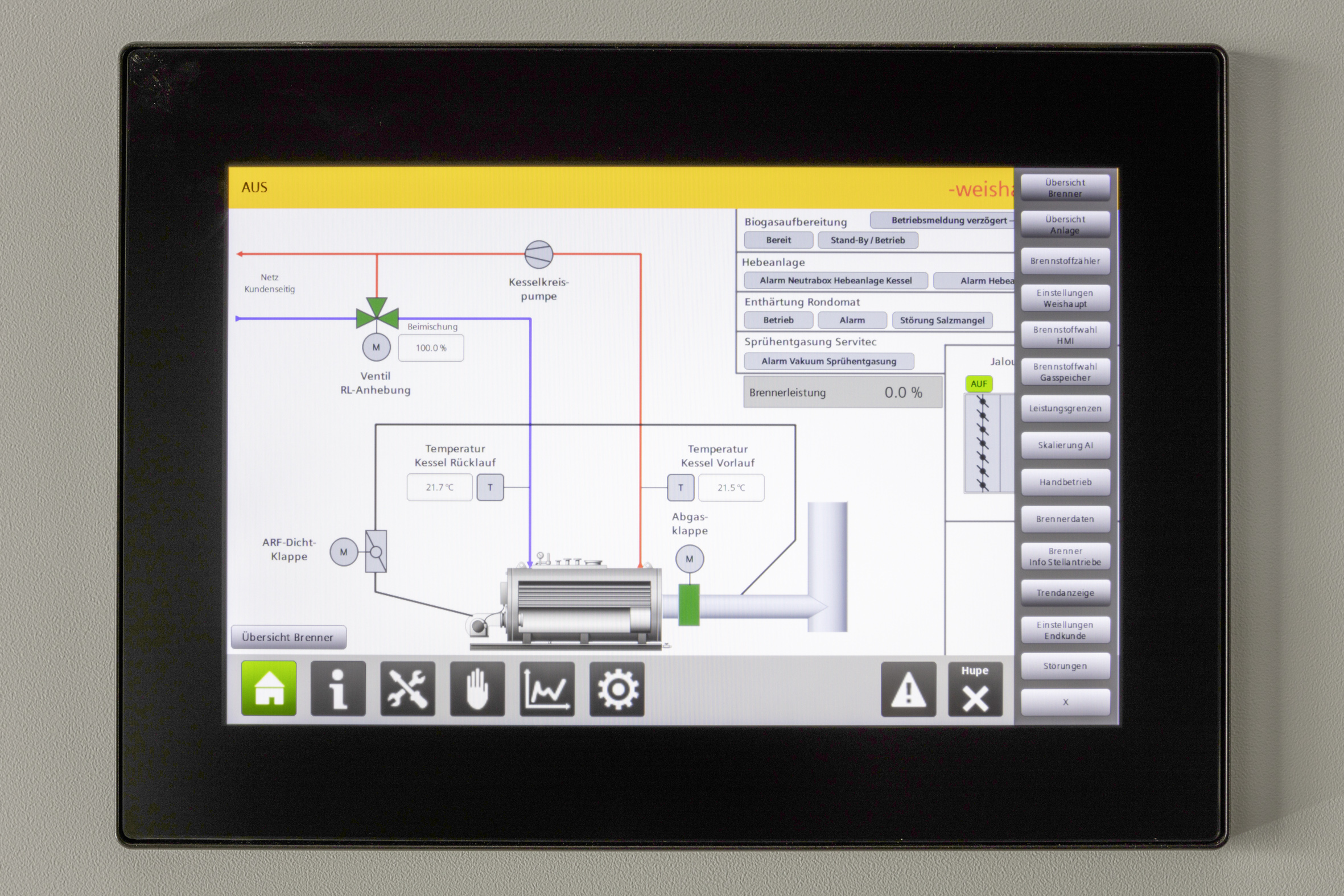 Panel táctil del sistema de control Weishaupt con control del quemador, control del suministro de biogás y regulación de la Caldera .